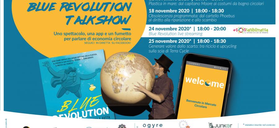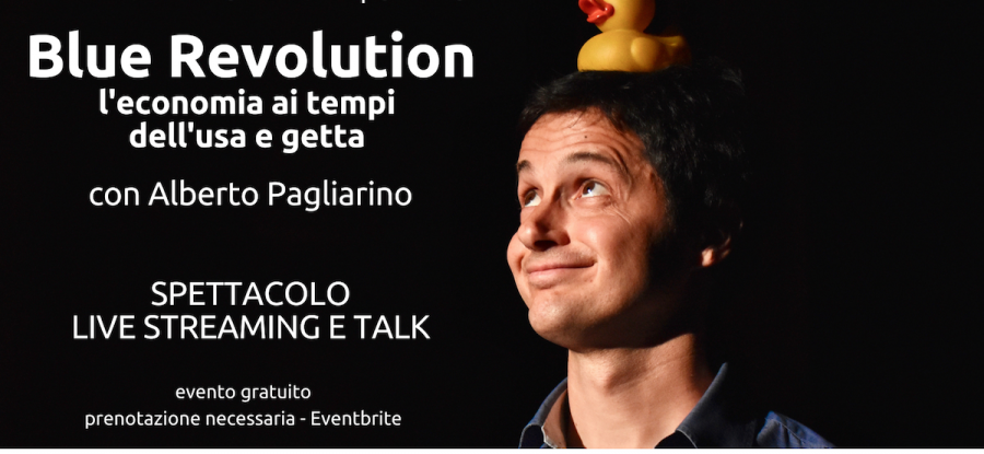 Lo spettacolo gratuito in live streaming il 24 novembre alle ore 18 Blue Revolution. L’economia ai tempi dell’usa e getta con Alberto Pagliarino sarà seguito da un talk con esperti di teatro, economia circolare, graphic novel e cittadinanza attiva, un appuntamento di eccezione inserito nel ciclo di talk online “Blue Revolution Talk Show”, su ambiente e circolarità, promossi da Mercato Circolare, Pop Economix e BeccoGiallo Editore in partnership con il progetto Ecco di Legambiente.